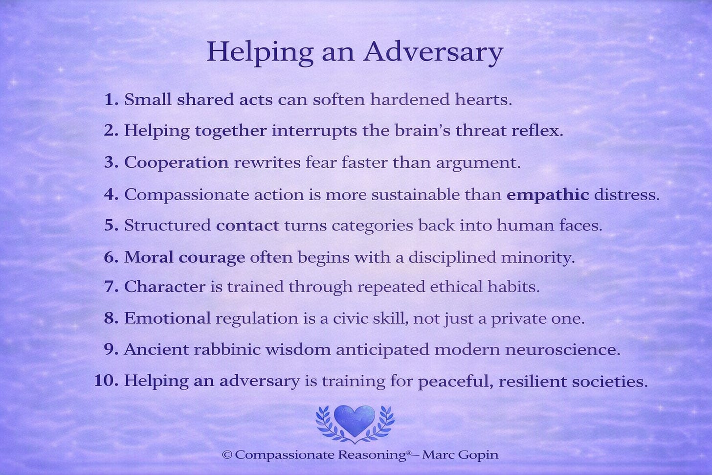 Ancient rabbinic texts implicitly understood this distinction by not requiring emotional intimacy with an adversary. They required a limited act of help instead. That discreet action channels moral energy into constructive behavior without emotional flooding that can overwhelm. It allows compassion to grow through action rather than through overwhelming feelings that can backlash into older hatreds. This insight is deeply consistent with modern findings about the neural basis of prosocial motivation.